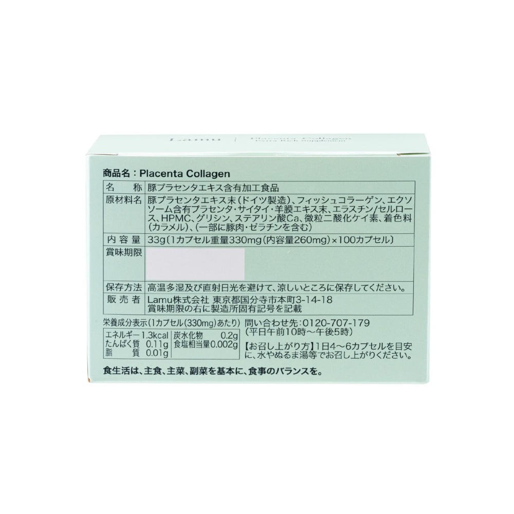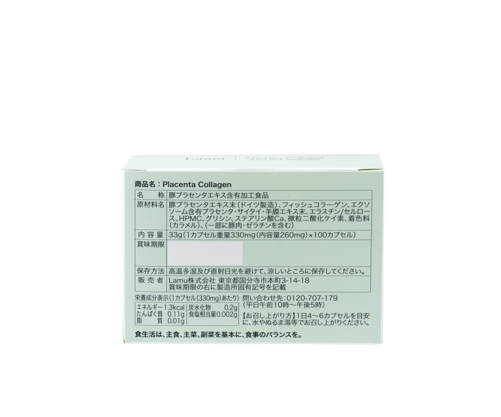 豚プラセンタエキス(ドイツ製造)、フィッシュコラーゲン、エクソソーム含有プラセンタ・サイタイ・羊膜エキス末、エラスチン/セルロース、HPMC、グリシン、ステアリン酸Ca、微粒二酸化ケイ素、着色料(カラメル)、(一部に豚肉・ゼラチンを含む)